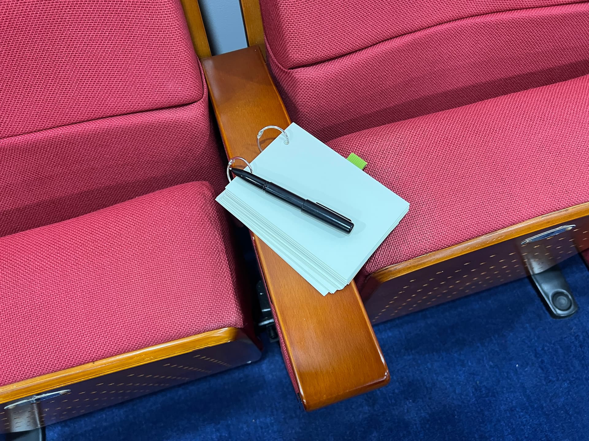 上午活动开始时,@frostming 作为第一棒带着本出发了。虽然最后接过笔记本的人没有按照提示归还,但我还是在主会场的最后一排找到了它: