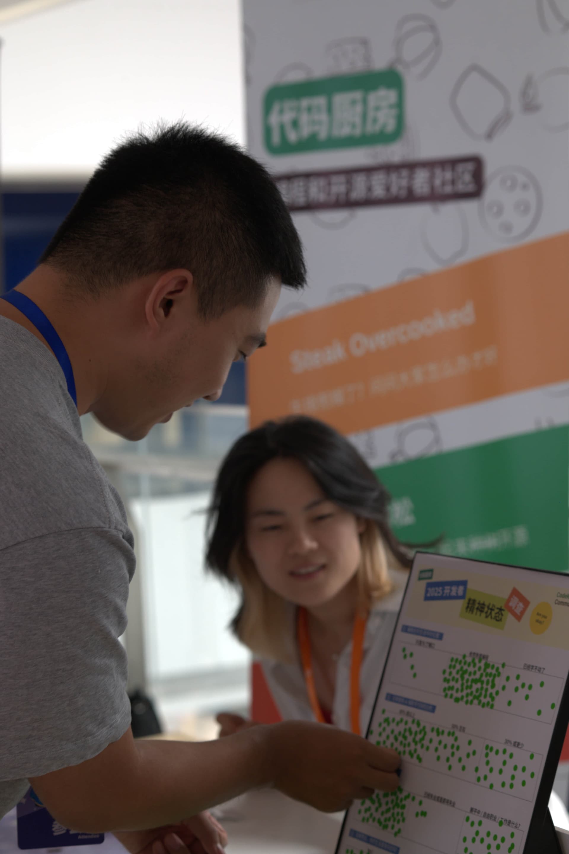 在展位上设计了两个活动,分别是「流浪记事本计划」和「开发者精神状态调查」。社区的本质是连接志同道合的人。在开源协作之外,这两个活动分别探索了用圆形贴纸和记事本作为连接媒介的可能。