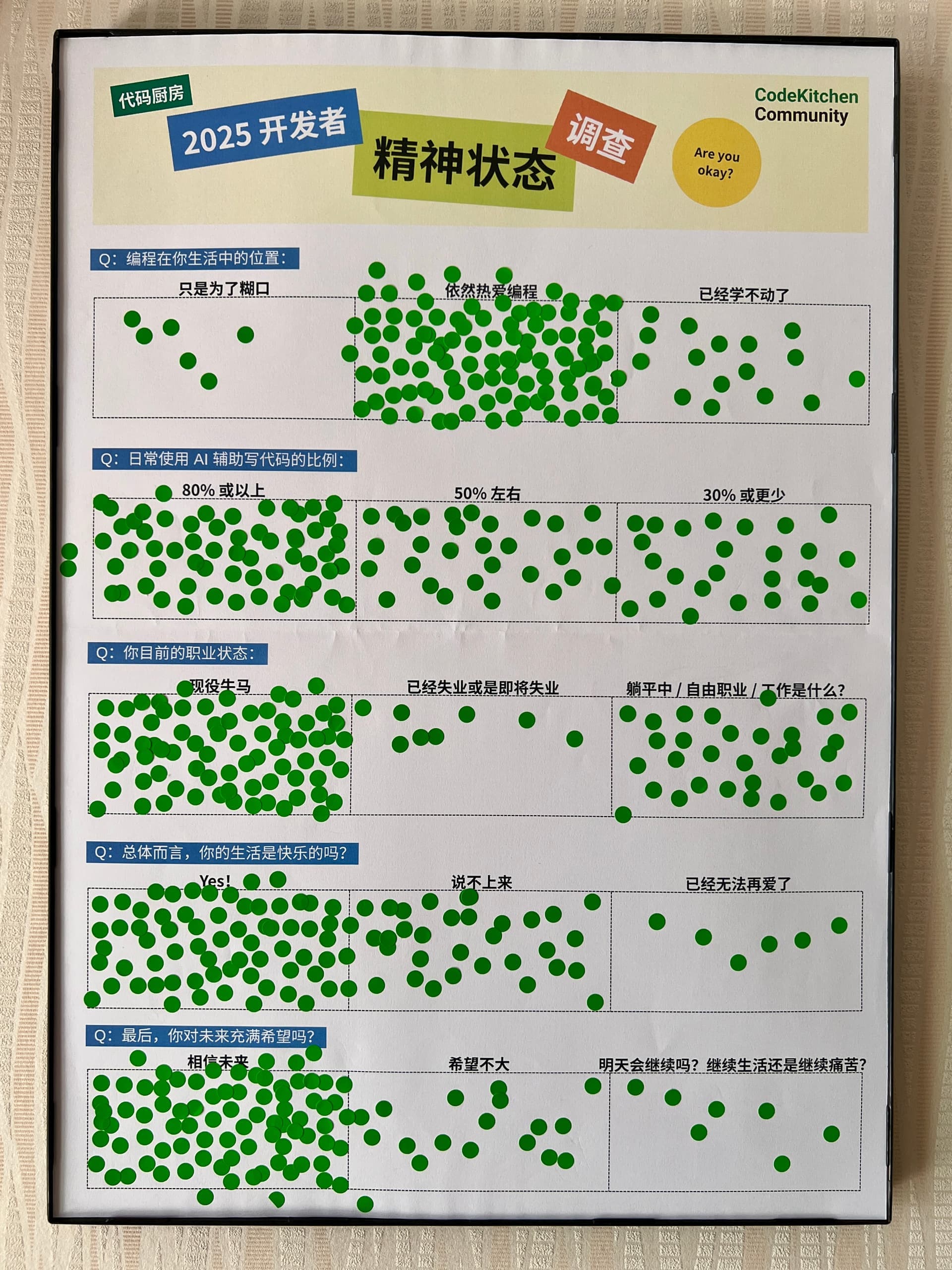 我一直很好奇大家对待生活、工作和编程是什么样的态度,所以这个活动算是从满足自己的好奇心出发的。因为 A3 尺寸太小,调查问卷只设置了五个问题,参与者通过用贴纸贴到对应区域来回答问题。